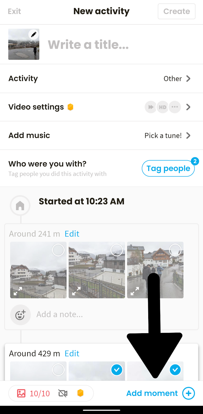 Relive will automatically add photos that you took during your activity to your video. Sometimes, you might want to add photos that were taken before or after your activity. You can add them with the Add Moment button.